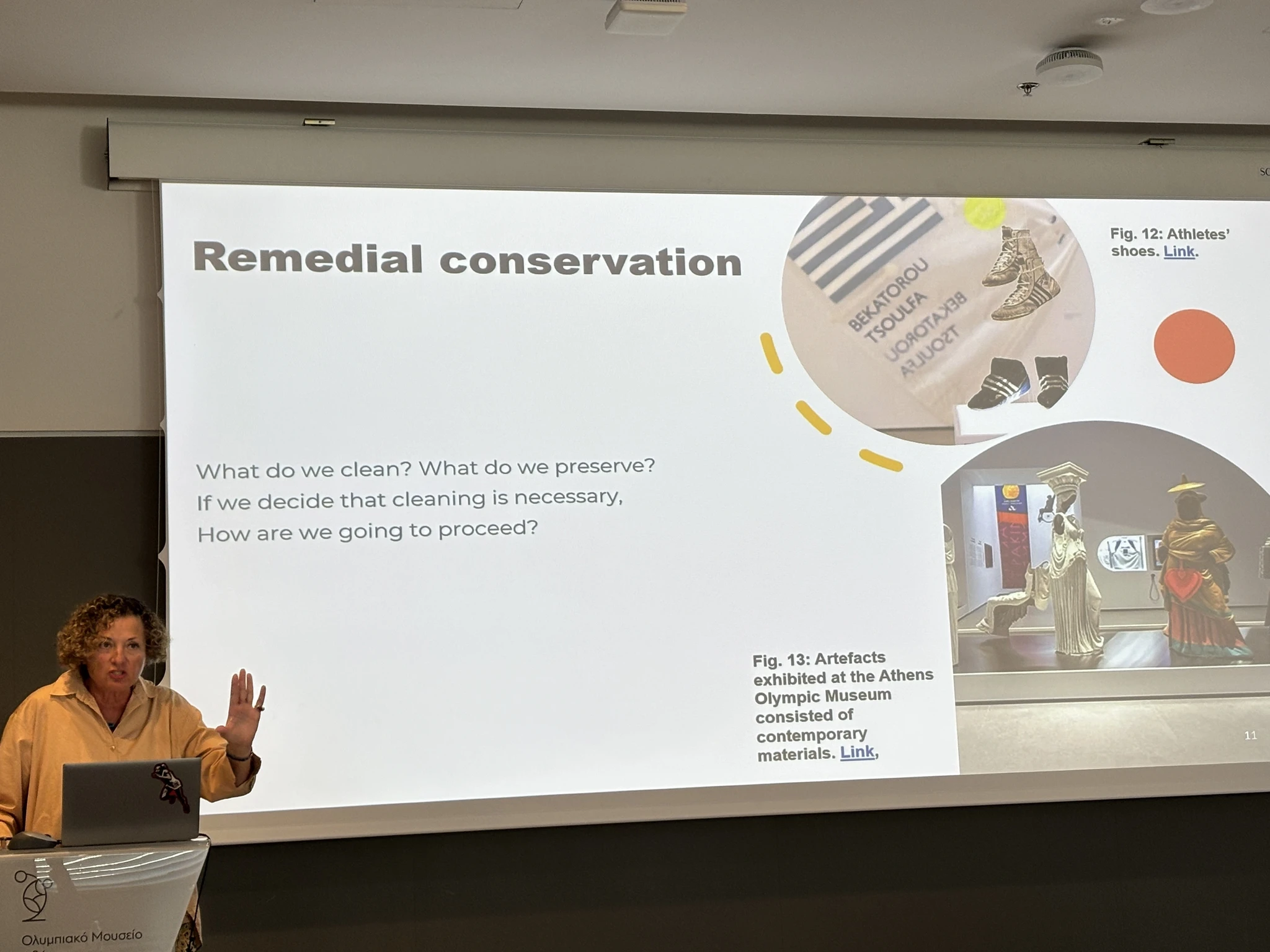 Teisel päeval toimusid ettekanded Ateena Olümpiamuuseumis, kus esinesin ettekandega „Uus ajutine näitus: Kuumenev finišijoon. Sport muutuvas keskkonnas“. Rääkisin näituse idee sünnist ja kujunemisest, avasin loomeprotsessi etappe ning tõin esile peamised väljakutsed, millega töö käigus kokku puutusime. Juttu tuli ka näitusele valitud esemetest ja erinevate osapoolte kaasamisest: koostööpartnerid, eksperdid, Tartu Raatuse Kooli lapsed, lapsed üle Eesti jt.